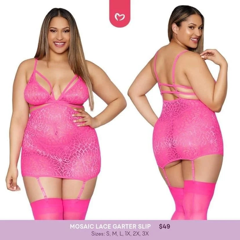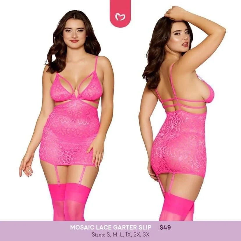 Get lost in the night with this mosaic lace garter slip. The weaving lines and strappy details create a map of desire that can take you anywhere. Adjustable shoulder straps, stretch fabric, and removable garters are designed to work for your body. The bold fuchsia color will provide the energetic vibe for your next sexy session.